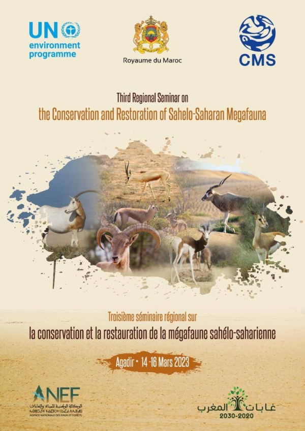 تنظم الوكالة الوطنية للمياه والغابات، بتعاون مع أمانة اتفاقية الأمم المتحدة حول المحافظة على الأنواع المهاجرة من الحيوانات المتوحشة (CMS)، أشغال الدورة الثالثة للملتقى الرفيع المستوى حول المحافظة على حيوانات الساحل والصحراء ذوات الحجم الكبير ، بأڭادير من 14 إلى 16 مارس 2023.