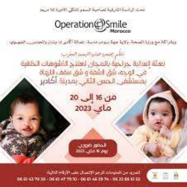 تنظم جمعية “عملية البسمة المغرب” خلال الفترة من 16 إلى 20 ماي الجاري بمستشفى الحسن الثاني بمدينة أكادير، حملة طبية إنسانية، من أجل إجراء عمليات جراحية تقويمية لعلاج التشوهات الخلقية المتعلقة بشق الشفة وشق سقف الحلق.