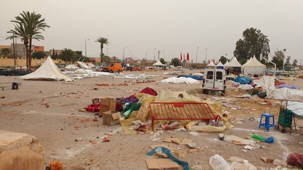 تسببت رياح قوية شهدتها ساحة باب الخميس بمدينة تارودانت، في وقت متأخر من ليلة الجمعة/ السبت 8 أبريل 2023، الى قلب فرحة عدد كبير من تجار الفخار ضمن فعاليات موسم تامصريت إلى حزن عميق، بعد خسائر مادية تعرضت لها تجارتهم ومصدر عيشهم، وذلك بعد أن هوت الخيام على رؤوسهم وعلى سلعهم المعروضة، ما خلف خسائر مادية جسيمة دون تسجيل إصابات أو خسائر جسدية سواء من هذا الطرف حيث المتبضعين أو الزوار وكذا العارضين.