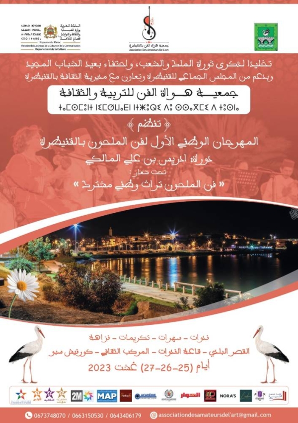 تخليدا لذكرى ثورة الملك والشـعب، واحتفاء بعيد الشـــــاب المجيد، وبدعم من المجلس الجماعي للقنيطرة وتعاون مع المديرية الإقليمية للثقافة، تنظم جمعية هواة الفن بالقنيطرة المهرجان الوطني الأول لفن الملحون بحاضـرة الغرب، دورة “ادريس بن علي المالكي” بكل من القصر البلدي وقاعة الندوات والمركب الثقافي وذلك، تحت شعار “فن الملحون تراث وطني مشترك” وذلك أيام 25 – 26 – 27 غشت الجاري.