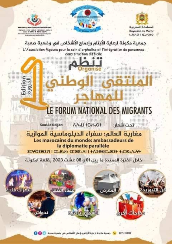 في إطار تخليد اليوم الوطني للمهاجر تنظم جمعية امكونة لرعاية الأيتام و إدماج الأشخاص في وضعية صعبة بتنسيق مع عمالة إقليم تنغير ، وبشراكة مع مجموعة من الشركاء المحليين والإقليميين والجهويين والوطنيين والدوليين النسخة الأولى من الملتقى الوطني للمهاجر خلال الفترة الممتدة ما بين 01 و 08 غشت 2023 تحت شعـار: “مغاربة العالـم: ســفراء الديبلوماسية الموازيـة” بمدينة قلعة امكــــــونة.