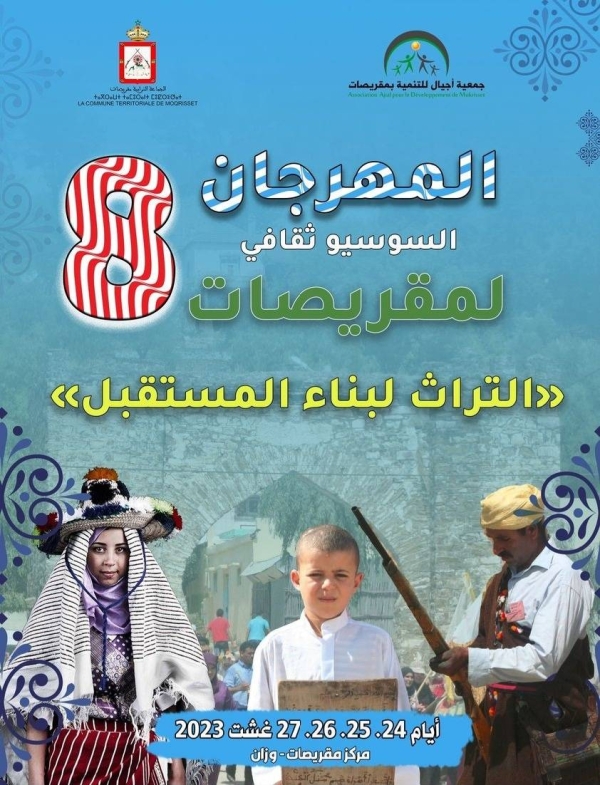 تنطلق خلال الفترة المتراوحة ما بين 24 و27 غشت 2023، الدورة الثامنة للمهرجان السوسيوثقافي لمقريصات نواحي إقليم وزان، المهرجان تنظمه جمعية أجيال للتنمية بمقريصات تحت شعار ” المهرجان السوسيوثقافي لمقريصات : التراث لبناء المستقبل” بشراكة مع المجلس الجماعي للمنطقة ومشاركة مجموعة جمعيات محلية المهرجان تدعمه عمالة إقليم وزان ومجلسها الإقليمي، ووزارة الثقافة والشباب والتواصل ــ قطاع الثقافة ــ ومجلس جهة طنجة تطوان الحسيمة ووكالة إنعاش وتنمية الشمال.
